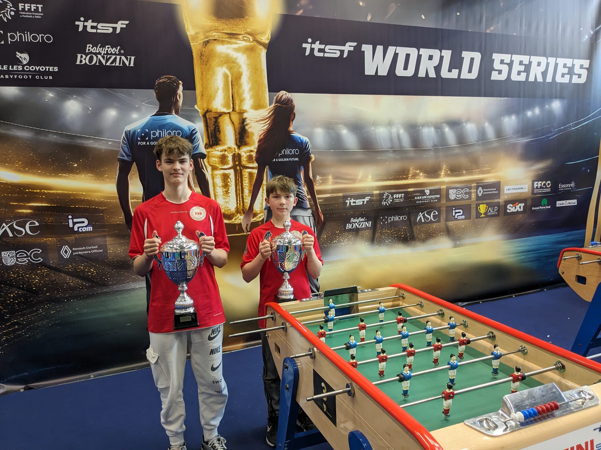 Foto (privat): Strahlende Sieger. Luis Janßen (links) und Thomas Haas haben Geschichte geschrieben. Satz eins ging in die Binsen, dann nahm Janßen immer mehr Fahrt auf: „Was Luis dann gegen die und dann die Wonsylds, also schon die Favoriten auf dem Tisch gespielt hat war…“, wieder sucht er nach Worte und fährt dann fort, „das hab ich so noch nicht oft gesehen. Um eine Bonzini WS zu gewinnen, brauchst du Stürmer die konstant gegen die Besten durchlegen und schießen“, nirgends so schwer wie auf dem Bonzini meint Haas. „Da gibt es aus meiner Sicht vielleicht ein bis zwei Hände voll, auf der Welt, die das spielen können. Luis war an dem Tag einer davon“ – und das mit 18 Jahren!